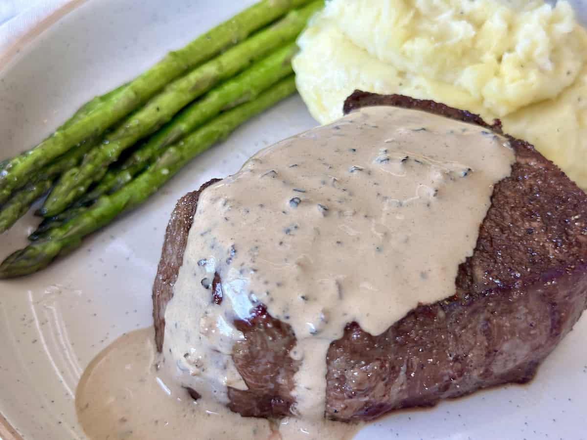 This rich sauce is really the perfect accompaniment for any steak. Filet mignon is the traditional steak found in steak au poivre. However, you can use your favorite steak! For example New Yorks and strip steaks are also great options.